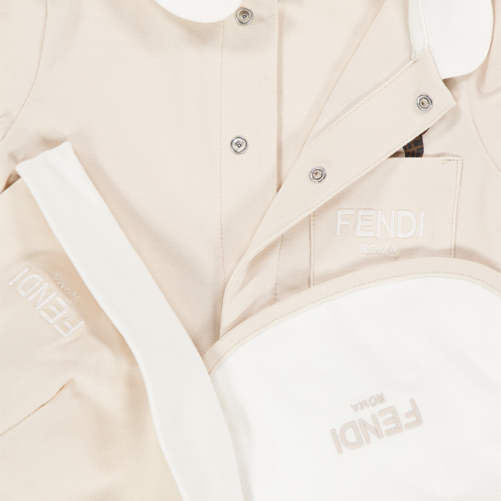 Zorg voor een stijlvolle en zachte start met dit unisex boxpakje van Fendi Baby, uitgevoerd in een serene beige tint. Het verfijnde ontwerp straalt rust en klasse uit, terwijl het geborduurde FENDI-logo subtiel luxe toevoegt. Gemaakt van hoogwaardige katoenmix die zacht aanvoelt op de tere babyhuid en ontworpen met praktische drukknoopsluiting voor moeiteloos omkleden. Een elegant item dat perfect is voor eerste momenten en dierbare herinneringen. 🤍