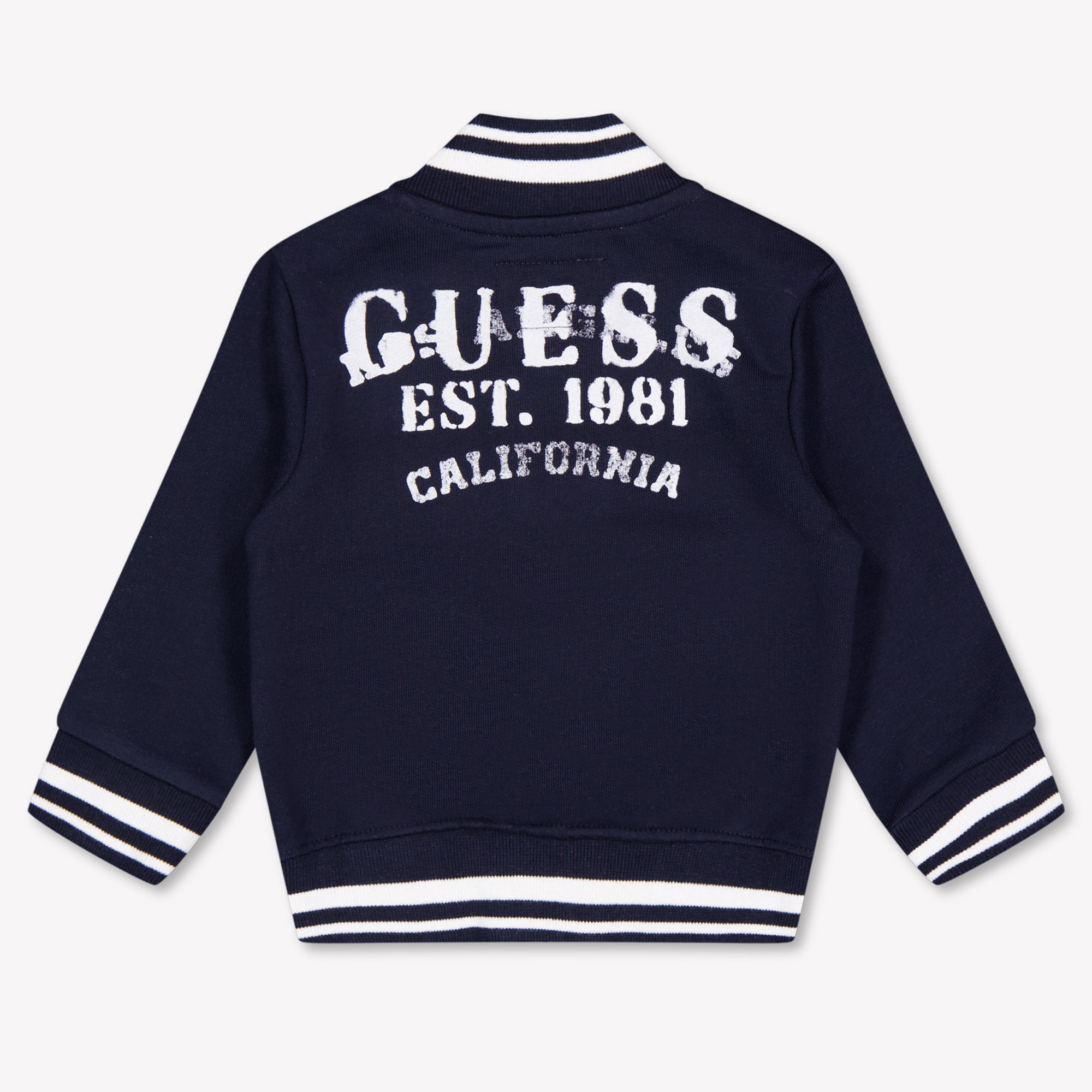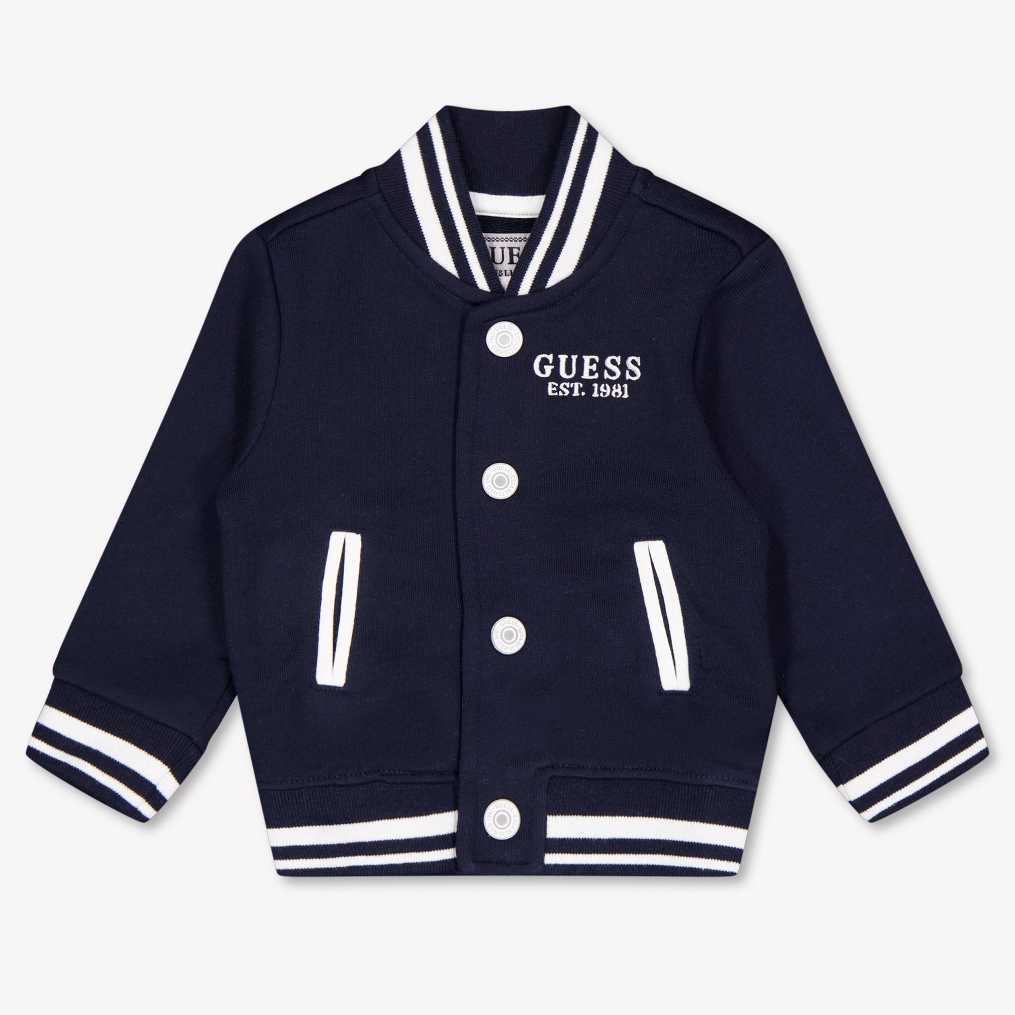Til zijn outfit moeiteloos naar een hoger niveau met dit navy vest van Guess Baby. De klassieke varsity-look, gecombineerd met het zachte katoen en de verfijnde afwerking, maakt dit een stijlvolle must-have voor elke jonge trendsetter. De witte contrastdetails, gestreepte boorden en het subtiele logo zorgen voor een sportieve maar luxe uitstraling die overal bij past – van speeltuin tot familiefeest. 💙