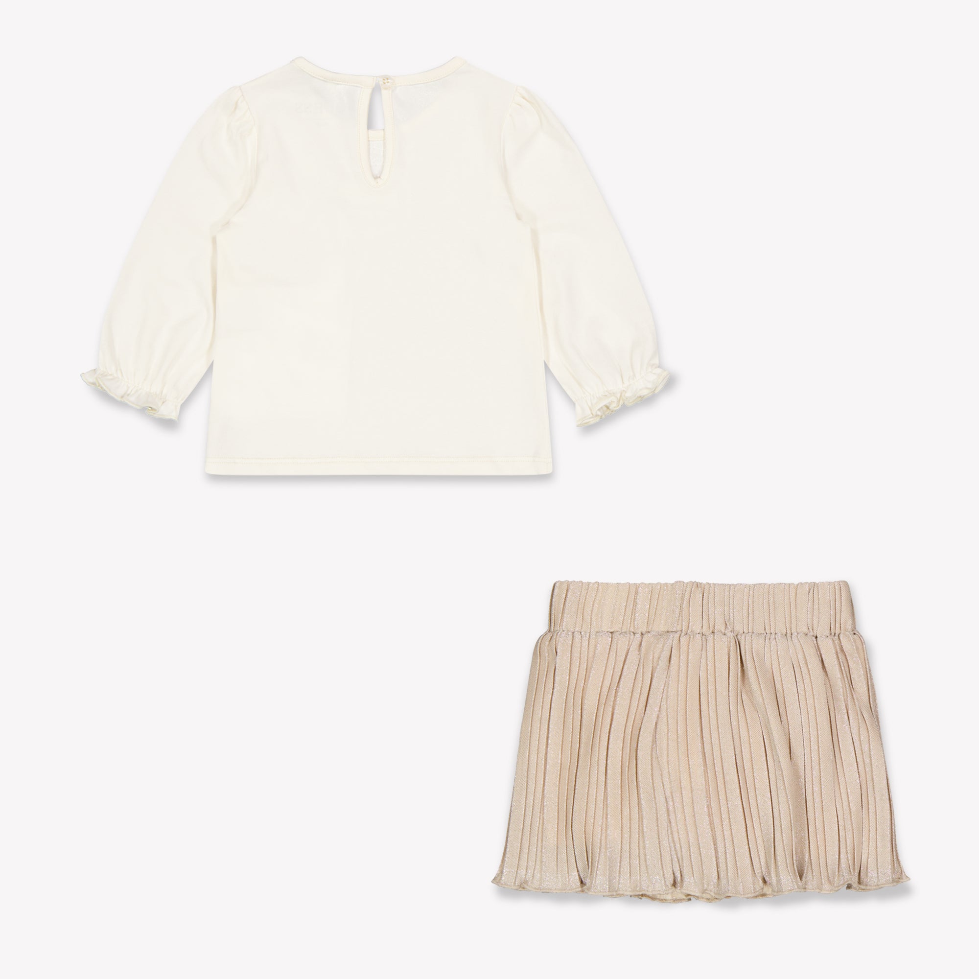 Een verfijnde outfit voor je kleintje, met een vleugje glamour ✨. Dit prachtige Guess setje bestaat uit een zacht, crèmekleurig shirt met een elegante strikapplicatie en subtiel logo — perfect in balans tussen speels en chic. Het plissérokje met metallic glans voegt een feestelijke touch toe, zonder in te boeten op comfort. Ideaal voor bijzondere gelegenheden of gewoon om elke dag stijlvol te zijn.