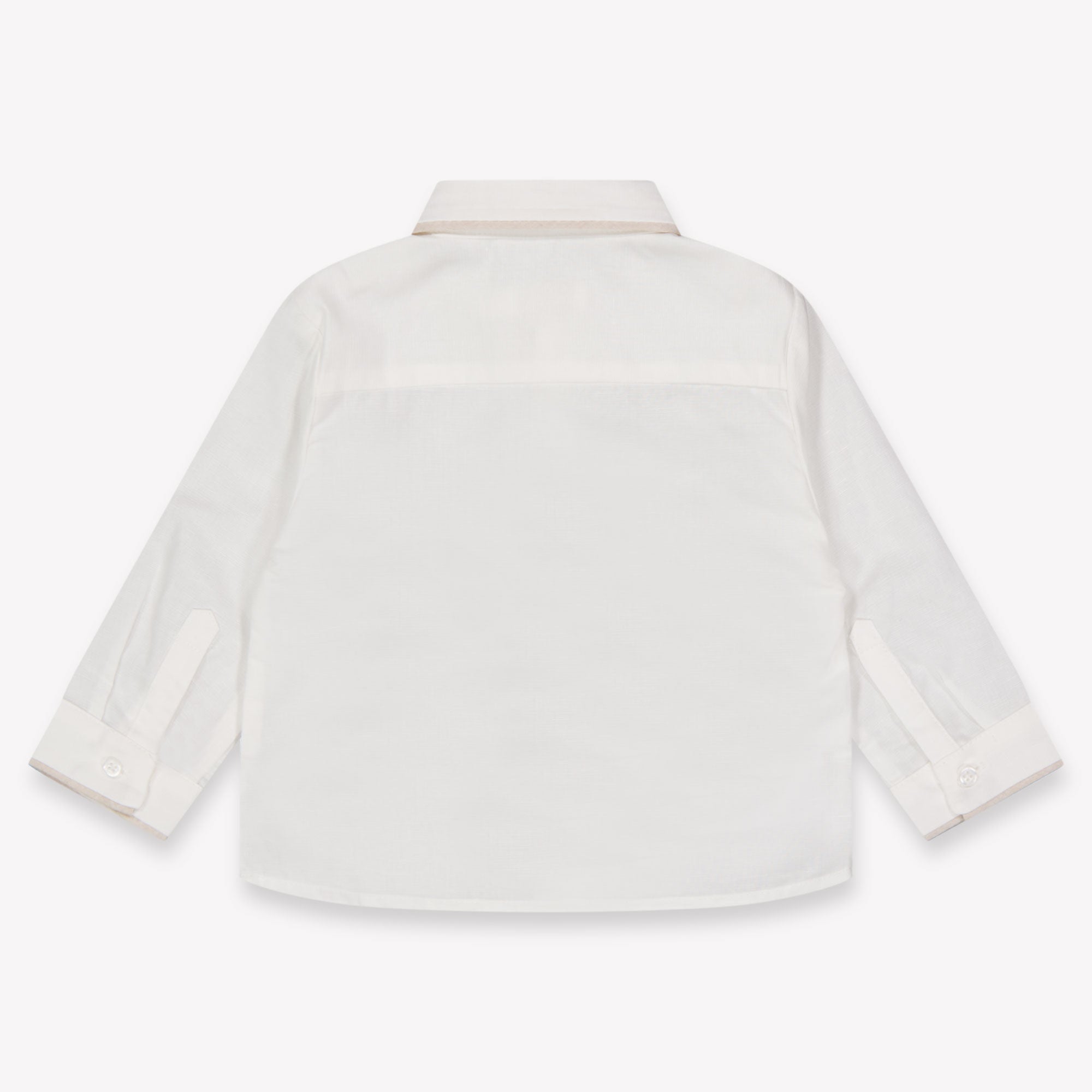 Deze verfijnde blouse in off white is een tijdloze essential voor de stijlvolle miniboy. Gemaakt van een luchtige, zachte stof die licht aanvoelt op de huid – ideaal voor zomerse gelegenheden. De subtiele beige accenten langs de knopenrij en manchetten geven de blouse een extra elegant detail. Perfect voor feestjes, bruiloften of als chique everyday look. Een investering in stijl én comfort. 🤍