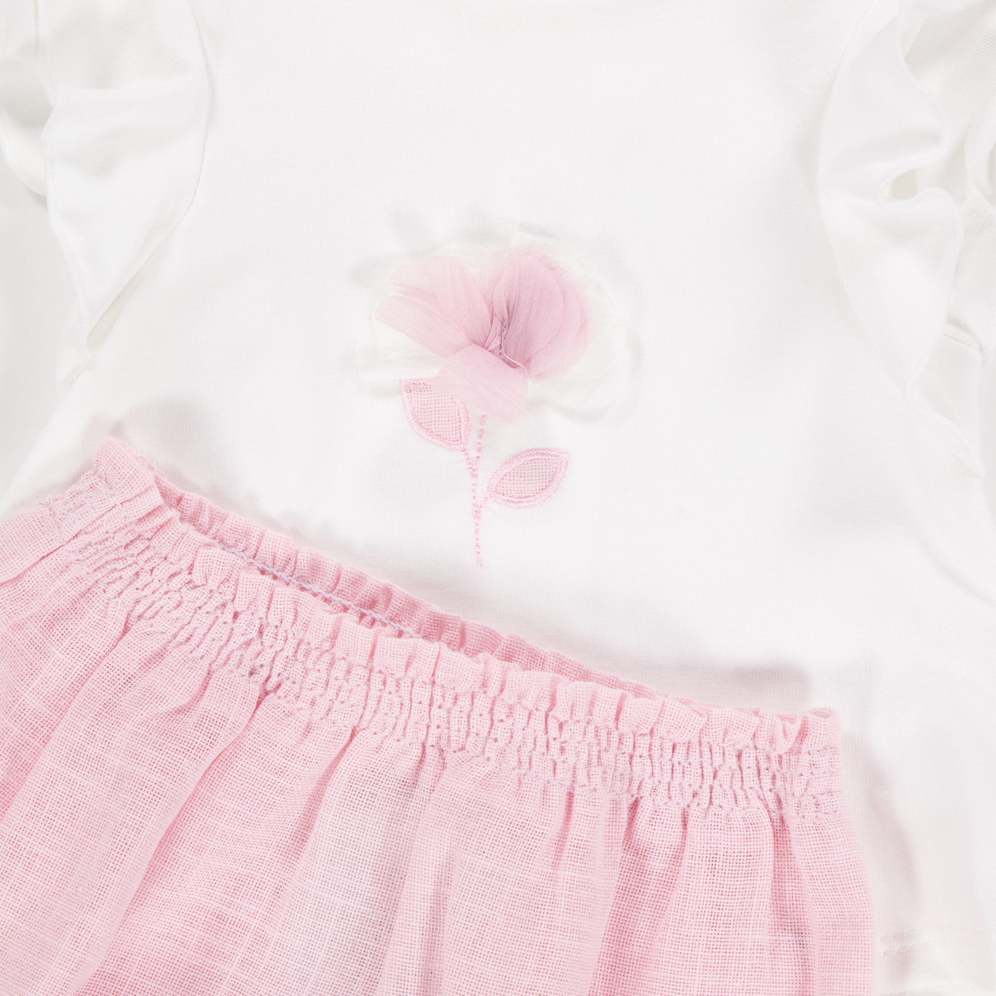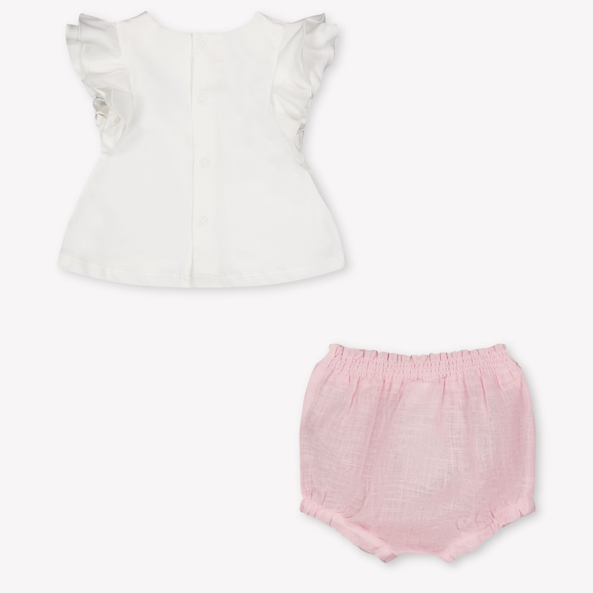 Een teder en stijlvol setje dat pure elegantie uitstraalt 🌸. Deze Mayoral babyoutfit in lichtroze combineert een zachtgevoerd bloomerbroekje met een wit topje, verfijnd afgewerkt met een subtiele bloemapplicatie van tule. De ruchemouwtjes geven een romantische touch, terwijl de luchtige stoffen zorgen voor optimaal draagcomfort op zomerse dagen. Perfect voor bijzondere momenten én alledaagse charme — een verfijnde keuze voor jouw kleintje of als liefdevol cadeau 🎁.