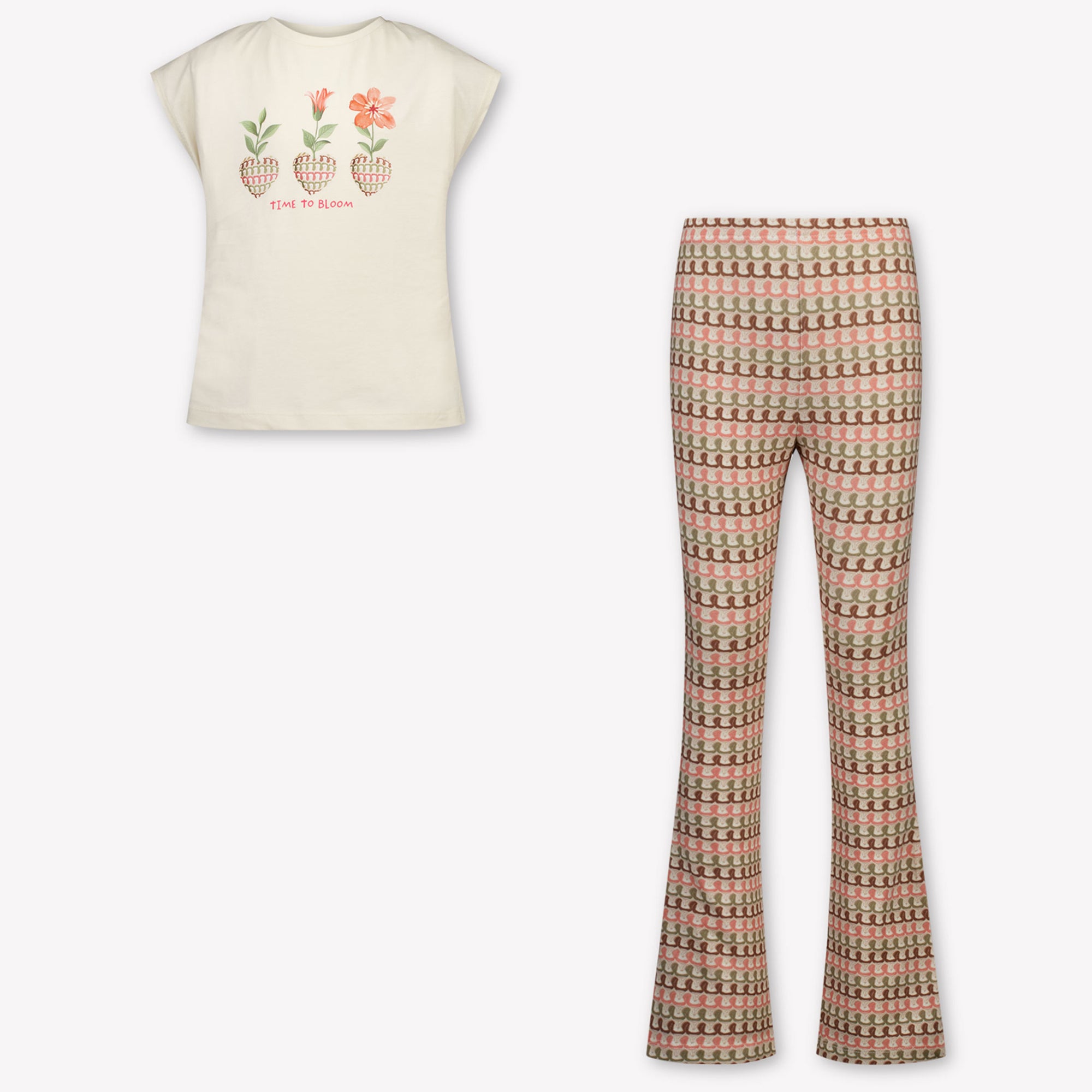 Een charmante set die moeiteloos elegantie en speelsheid combineert. Dit Mayoral setje in zacht pastelroze bestaat uit een soepel vallend T-shirt met bloemige print en de quote “Time to Bloom”, gecombineerd met een flared legging in een grafisch patroon. De comfortabele jersey stof voelt zacht op de huid en biedt optimale bewegingsvrijheid. Een stijlvolle keuze voor zonnige dagen, familie-uitjes of feestelijke momenten 🌸