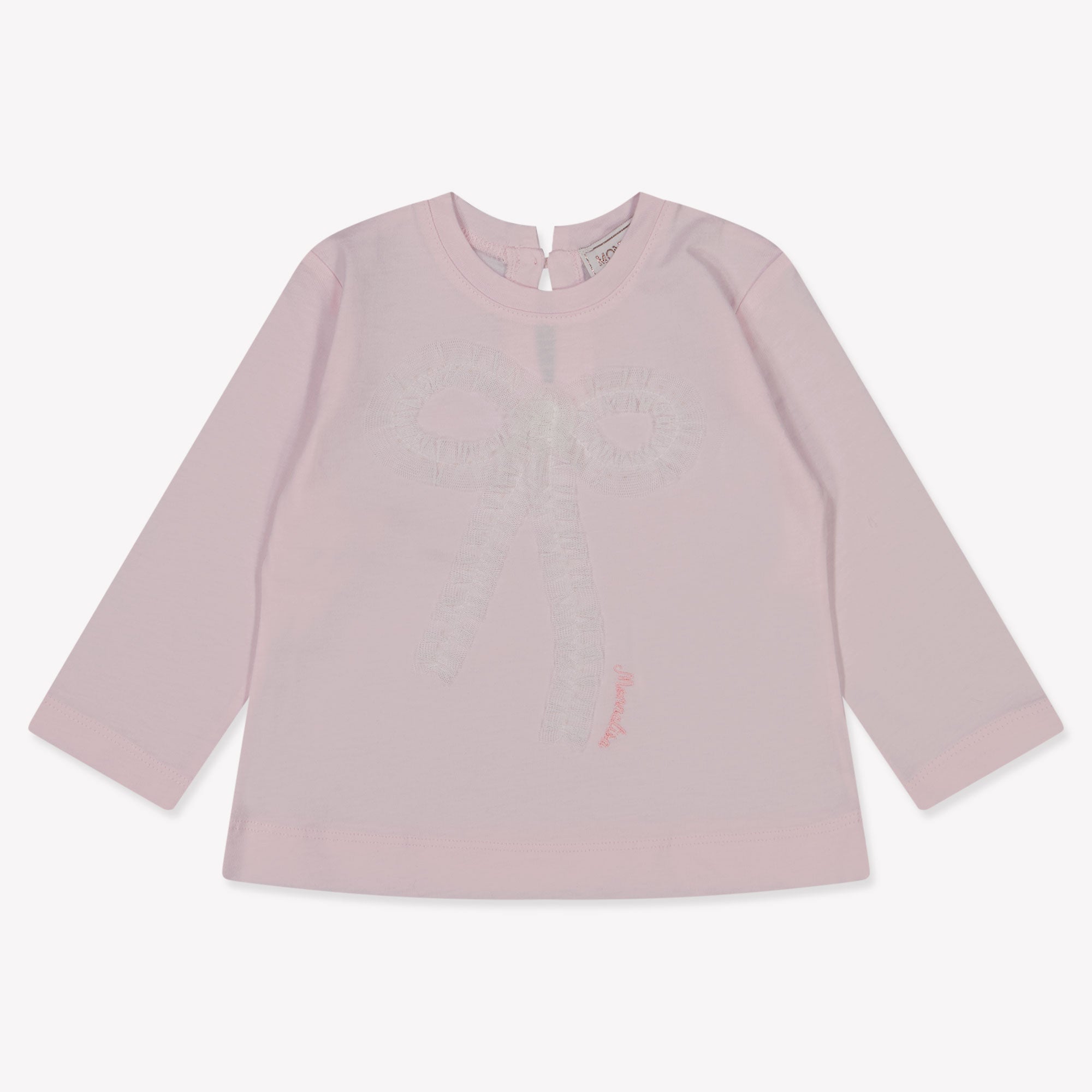 Ontdek de verfijning van de MonnaLisa kinder t-shirt in licht roze. Dit elegante kledingstuk, verrijkt met een delicate voile strik, is de belichaming van tijdloze schoonheid en uitzonderlijk vakmanschap. De zachte stof omhult de huid als een tweede laag, perfect voor de gevoelige huid van je kleintje.